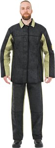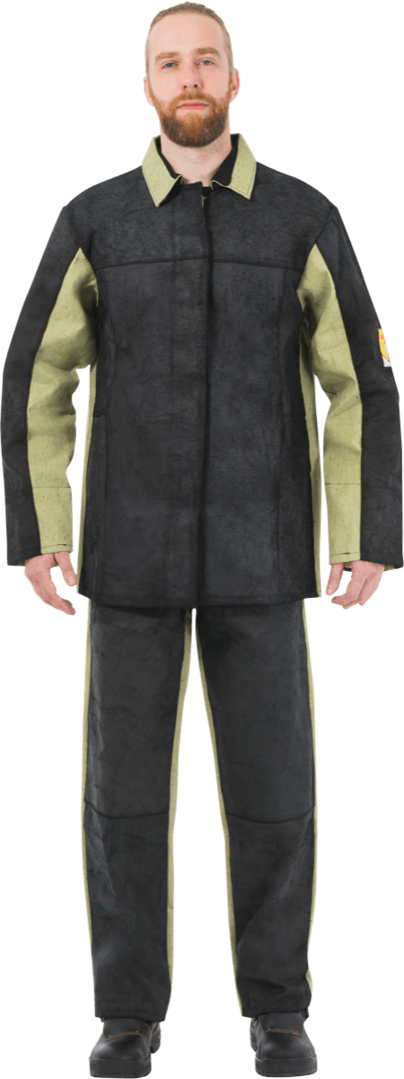 Площадь спилковых накладок — 2,6 м2. Куртка прямого силуэта с потайной центральной застежкой на 5 пуговиц, втачными рукавами и воротником. Куртка имеет вентиляционные отверстия под проймами в боковом шве и по линии настрачивания кокетки.Полочки изготовлены из спилка с отрезными бочками и внутренними боковыми карманами. Отрезные бочки изготовлены из спилка. Полочка и отрезные бочки имеют подкладку из бязи. Карманы размещены в шве притачивания отрезного бочка и имеют подкладку из бязи.Спинка куртки изготавливается из брезента со средним швом и с кокеткой из спилка. Подкладка спинки выполнена из бязи.Рукава втачные двухшовные, передняя часть из спилка, задняя из брезента. Рукава изготовлены на подкладке из бязи, имеют напульсники из бязи.Брюки:застёжка в боковых швах на петли и пуговицы.ТР ТС 019/2011 ГОСТ 12.4.250-2013 Защитные св-ва:Тр (2-й класс)— защита от искр и брызг расплавленного металла.Страна производства: РОССИЯ ,ОКПД2 14.12.11.120